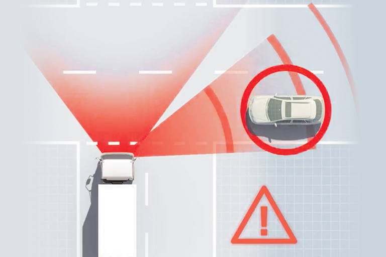 FCW scans the road ahead to detect vehicles, pedestrians, bicycles, or other obstacles. Using a stereo camera system enables the truck to judge distance and relative speed in a similar way to human eyesight. If it senses a potential collision, it provides visual and audible warning to the driver.